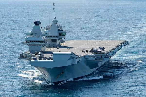 2021年5月、イングランド南部のポーツマス海軍基地に停泊する空母「クイーン・エリザベス」を、女王エリザベス2世が訪問した時の様子(画像:イギリス海軍)。