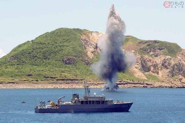 訓練で機雷を実際に爆破処理する海上自衛隊掃海隊群の掃海艦「ひらど」(画像:海上自衛隊)。