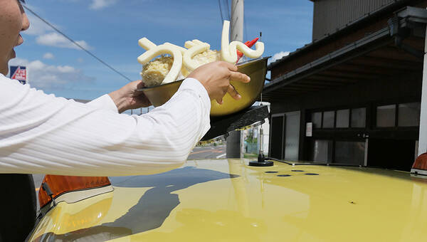 タクシーの屋根の上には、うどんをかたどった幅30cmほどの巨大な“行燈”がどっかりと鎮座し、対向車のドライバーが「えっ!」と見返したり慌てて写真を撮ったりするほどに目立ちます。JR高松駅や高松空港などの待ち合わせ場所でも、まずわかるほどに一目瞭然。