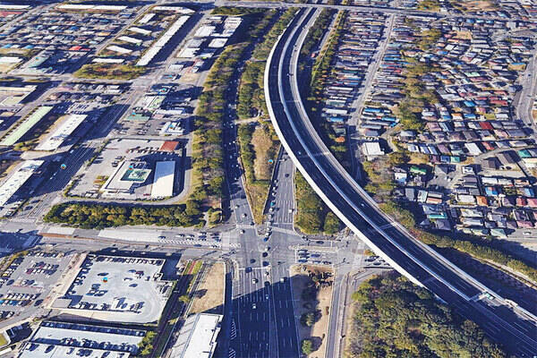 場所は千葉市内、国道357号に国道14号が合流し、357号に並行していた東関東道の高架が成田方面へ分かれていく箇所付近です。このあたりには、東関東道の検見川・真砂スマートICが整備される計画ですが、それにともなう渋滞対策として、東行き(市原方面)のみ、その先の千葉西警察入口交差点と稲毛浅間神社前交差点をまたぐ立体部が設けられる見込みです。