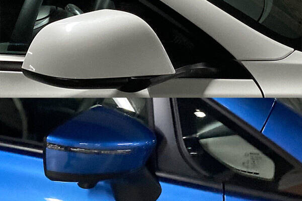 上のクルマはサイドミラーがAピラーの根本につく。下のクルマは位置をやや後ろへ下げてドアに直付けされている(乗りものニュース編集部撮影)。
