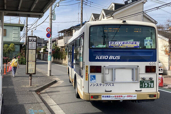 この「稲荷坂通り」は、直線的ながら、普通車でもすれ違いに難儀する住宅街の区間が700mほど続き、そこをバスが双方向で行き交います。特筆すべきは本数の多さで、朝は6分間隔の時間帯もある、いわば“ドル箱”路線。そのため、途中の国分寺第三中学入口バス停などが退避スペースを兼ねているほか、沿道に配置された誘導員が運行をサポートしています。