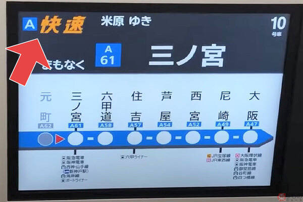 関西でJRの列車を利用すると、普通や新快速といった種別の左隣にアルファベットが表示されていることがあります。JR神戸線の例なら、「A快速 米原」といった具合です。