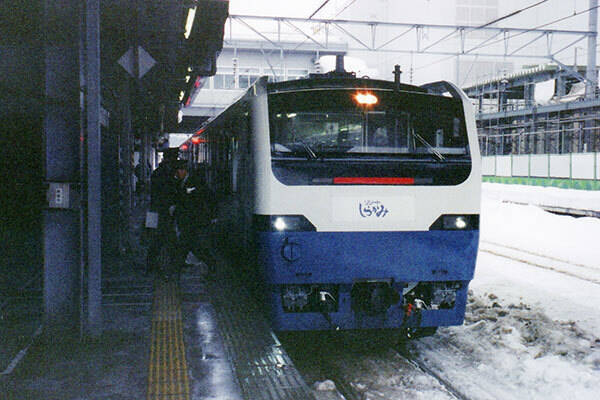 1997(平成9)年に五能線の観光列車「リゾートしらかみ」としてデビュー。のちに「ぶな(本来は漢字)」編成と「くまげら」編成が増備され、この初代は「青池」編成と名づけられています。