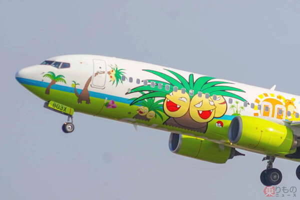 「JA803X」が担当機に宮崎を拠点とする航空会社のソラシドエアが2023年3月2日より、初の全面特別塗装機となる「ナッシージェット宮崎」を就航させました。2020年より「宮崎だいすきポケモン」として、宮崎県、そしてソラシドエアともコラボ活動を重ねてきたポケモン(ポケットモンスター)のキャラクター「ナッシー」などとコラボしたものです。