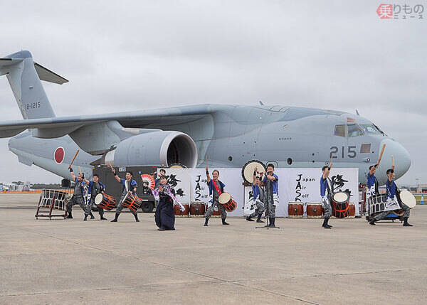 C-2輸送機の前で和太鼓演奏する空自隊員。途中で法被や和装風衣装に着替える演出もあった(布留川 司撮影)。