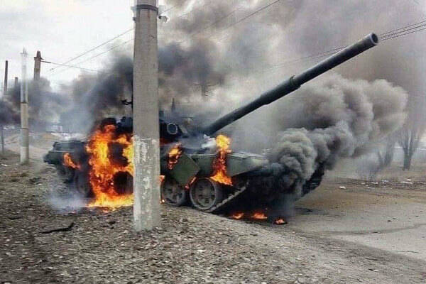 ウクライナ国内で炎上するロシア軍戦車(画像:ウクライナ軍参謀本部)。