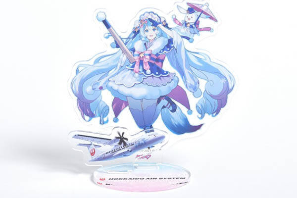 販売されるグッズは、「雪ミク」のメインビジュアルの原画を使用したHACオリジナルアクリルスタンド(2000円)や「雪ミク」特別塗装機の缶バッジセットやクリアステッカーセットなどです。これらのグッズは、これまでHAC機内がメインの購入経路でしたが、今回の展開でインターネットや羽田空港でも買えるようになります。