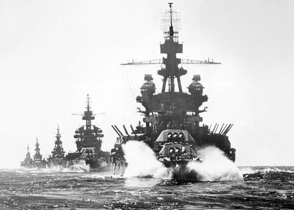 太平洋戦争末期の1945年、リンガエン湾を航行するアメリカ戦艦群(画像:アメリカ海軍)。
