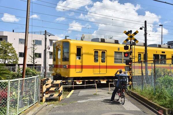 東武亀戸線の亀第12号踏切。亀戸線では、2016年からリバイバルカラーの車両を運行。通過しているミディアムイエローの車両は2017年に運行開始(2023年4月、小川裕夫撮影)。