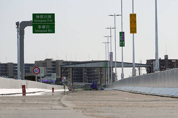 多摩川の河川敷から新しい橋桁の上にあがってみると、すでに舗装の下層部分が済み、標識類も設置されていました。都県境を示す「神奈川県」の看板(カントリーサイン)が、すぐ横の本線に並んで立っています。ただ、その位置は数メートル、新しい橋桁のもののほうが神奈川側にズレています。