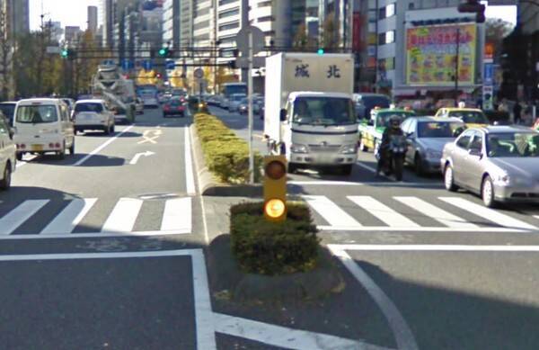 中央分離帯の先端にあることが多いブリンカーライト(画像:Google)。