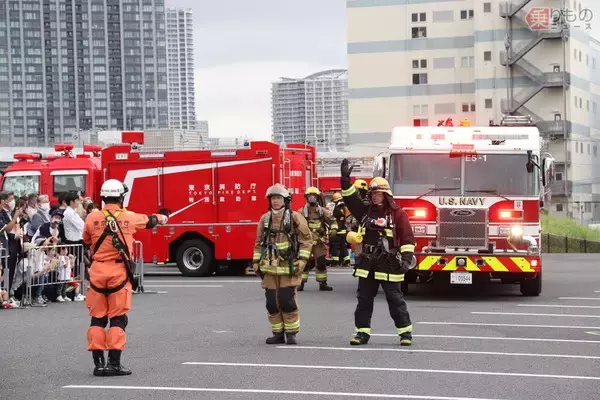 今年は過去最多となる全325の会社と団体が出展。東京湾を臨む屋外スペースでは、東京消防庁のハイパーレスキュー隊を中心に、消防団や在日米海軍の消防隊などが参加して本格的な消火・救助演技が行われています。