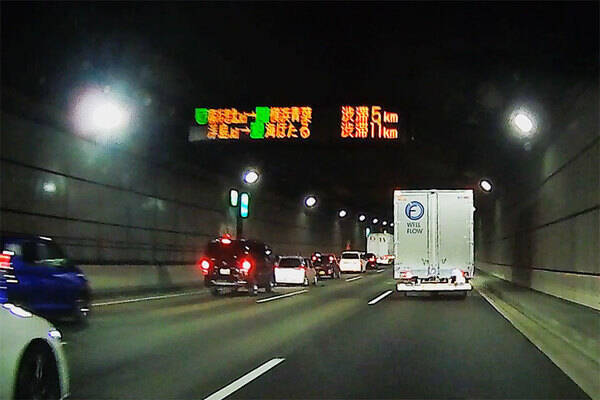 首都高湾岸線西行き、川崎浮島JCT手前。アクアライン下り線からの車列が左車線へ伸びている。この渋滞はロードプライシングでは解消されない見込み(ドラレコ画像)。