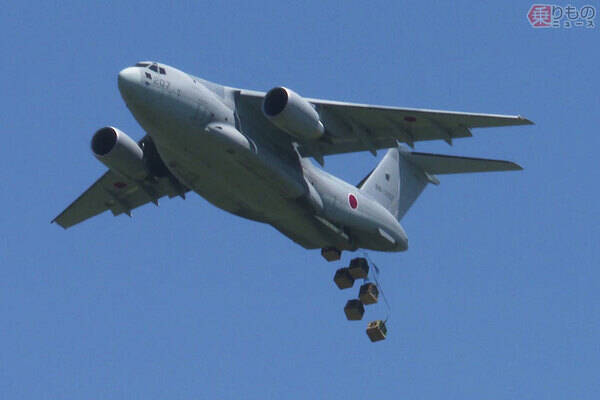 こうすることで輸送機は着陸することなく素早く貨物を届けることができ、一定のスペースがあれば空港以外の場所でも荷物を届けることが可能です。非常時でも対応できる自衛隊らしいデリバリー方法といえるでしょう。