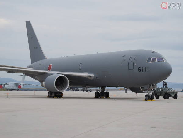 KC-46Aは、ボーイング767旅客機がベースの軍用機です。元々はアメリカ空軍向けに開発されたもので、日本も航空自衛隊向けの新たな空中給油・輸送機として2015年に採用を決定。初号機は2021年10月29日に日本へ到着、2号機も2022年2月24日に到着したものの、このころはコロナ禍の最中であったため、航空祭などは開催されず、今年(2023年)の航空祭でようやくお披露目されたのです。