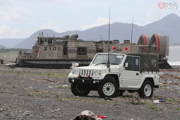 上陸演習で海上自衛隊の上陸用舟艇(LCAC)から海上輸送されてきた警務隊の小型トラック(武若雅哉撮影)。