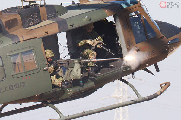 UH-1J多用途ヘリコプターに搭載され、空の上から射撃を行う12.7mm重機関銃(乗りものニュース編集部撮影)。