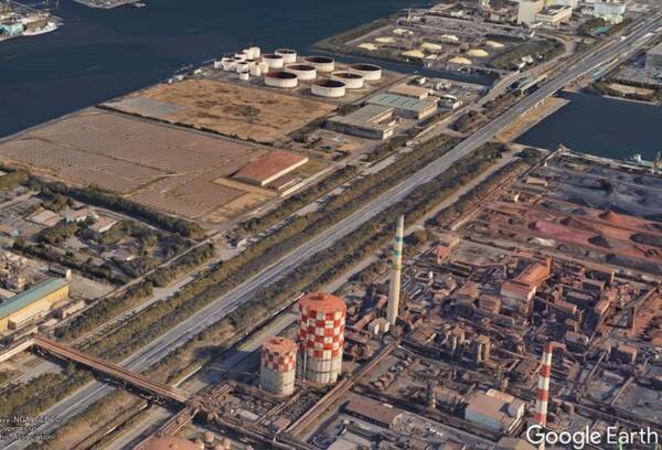 湾岸線に新設再開発が予定される川崎市の扇島地区(画像:Google Earth)。