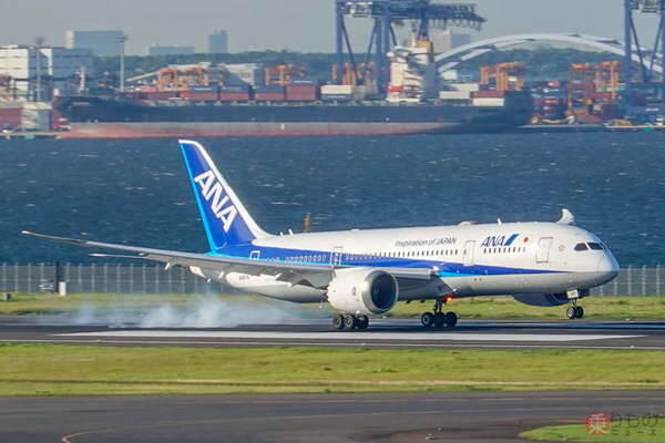主脚から煙をあげて接地するANA機(乗りものニュース編集部撮影)。