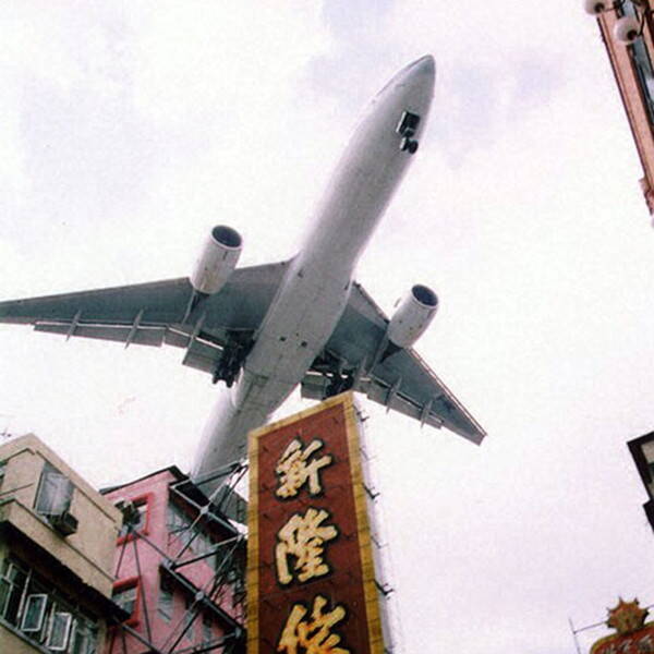 啓徳空港に着陸しようと香港の市街地を低空でかすめる旅客機。このような風景は香港名物となっていた(パブリックドメイン)。