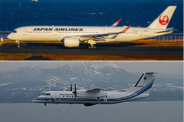上がJALのA350-900、下が海上保安庁のDHC-8-300(画像:乗りものニュース編集部/海上保安庁)。