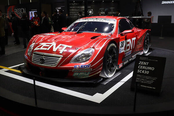 ブリヂストン製タイヤの「POTENZA RACING TIRE」を装着した2013スーパーGT参戦マシンの「ZENT CERUMO SC430」(乗りものニュース編集部撮影)。
