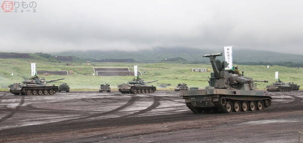 東日本大震災と同年の2011年に実施された富士総合火力演習において、終了後、東北応援のノボリを掲げる参加部隊(月刊PANZER編集部撮影)。