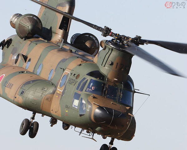 陸上自衛隊のCH-47JA輸送ヘリコプター(乗りものニュース編集部撮影)。