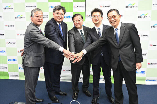 日本郵船らによるアンモニア燃料アンモニア輸送船建造の記者会見の様子。2024年1月26日(深水千翔撮影)。