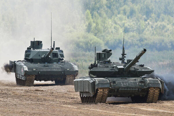 ウクライナ侵攻で投入されている戦車の中でロシア軍の最新型であるT-90Mと、後方を走るのが以前戦場に投入された噂のあった最新型のT-14「アルマータ」(画像:ロシア国防省)。