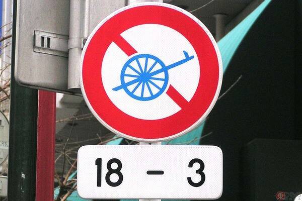 東京の銀座に珍しい道路標識があります。中央に大八車の絵が描かれた規制標識「自転車以外の軽車両通行止め」です。とりわけ銀座駅の南側、銀座5丁目交差点近辺の一方通行路に対して設置されています。