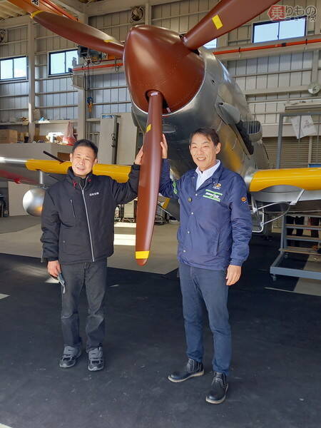 「飛燕」の金属製原寸大模型を製作した、株式会社日本立体の齊藤社長(左)とオーナーである株式会社ドレミコレクションの武社長(右)。この2人がいて、ここまで素晴らしい原寸大模型が完成した(吉川和篤撮影)。