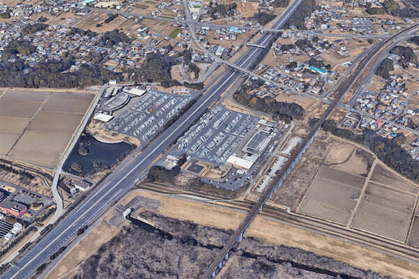 常磐道の守谷SA。右に並行するつくばエクスプレスの両側の道路は、SA付近で途切れている(画像:Google earth)。