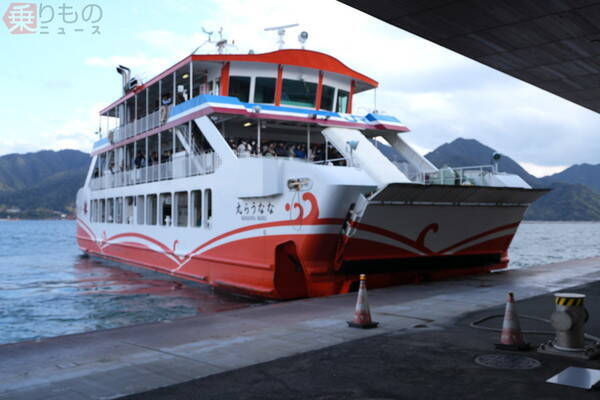 同社は3隻で運航していますが、当日就航していたのは「ななうら丸」(3代目)でした。2016(平成28)年に就役した最新フェリーです。船名は「厳島に7つの浦があること」に由来します。総トン数268tで、全長37.5m、全幅10.0mと小型。定員は座席180、立席620で合計800名と、収容力は抜群です。