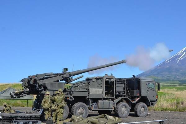 射撃中の19式装輪自走155mmりゅう弾砲(画像:陸上自衛隊富士駐屯地)。