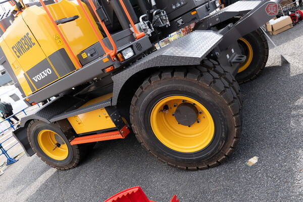 幕張メッセで開催された展示会に、ボルボ建機がタイヤで走る油圧ショベルを出展。日本では少数派のタイヤで走るホイール式油圧ショベルですが、ボルボ建機の車体は都市部で使うにはうってつけなのだとか。
