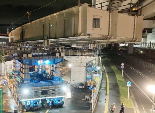 今回は夜間通行止めのうえ、多軸式特殊台車を使用し筒井町交差点をまたぐ橋桁の一括架設を行います。