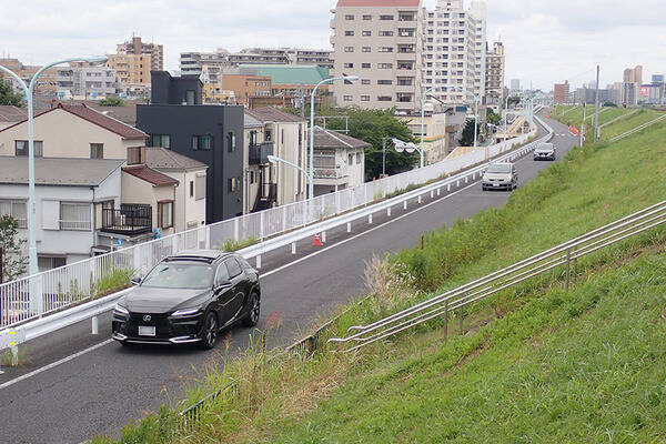 道路はほぼ直線で、信号はわずか。川とは反対側の市街地に出入りするクルマは基本的に一段下に並行して走る側道を使うため、クルマの流れが滞ることはほとんどありません。