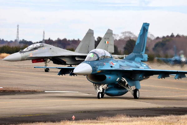 2023年5月、茨城県の航空自衛隊百里基地で訓練を行う日印両国の戦闘機。奥がインド空軍のS-30MKIで、手前が日本のF-2戦闘機(奥)(画像:インド空軍)。