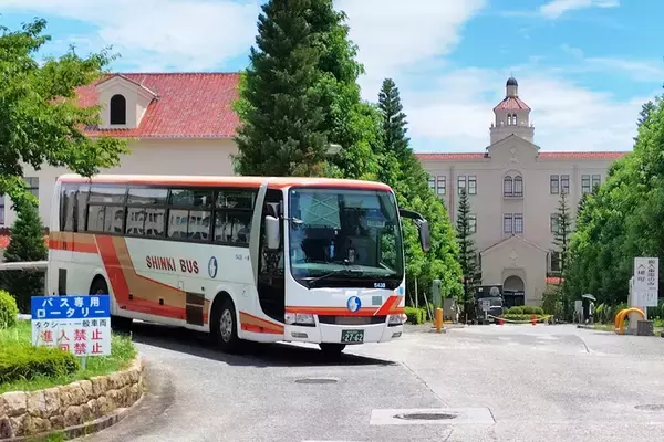 神姫バスの「関学エクスプレス」。背後はスペイン風建築の関西学院大学のKSCこと神戸三田キャンパス(成定竜一撮影)。