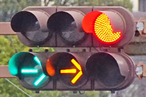 さて、一般的なのは青色の矢印信号です。意味は「車両は、黄色の灯火又は赤色の灯火の信号にかかわらず、矢印の方向に進行することができること」(道路交通法施行令第2条)。交通量の多い交差点では、全国的に見かけます。