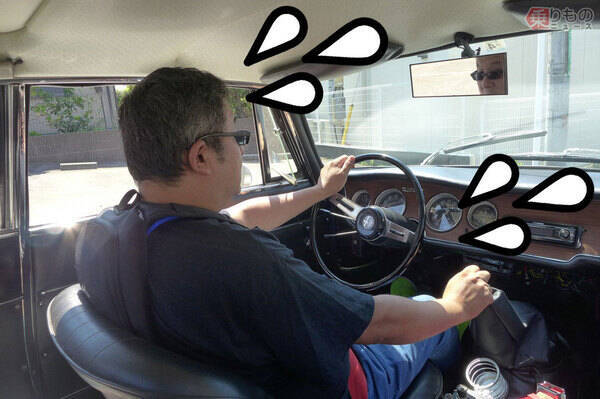 水冷服「アイスマンPRO-X」を身につけた状態でクーラーのない旧車を運転。窓を開けていると走行風が入るので水冷服との相乗効果で暑さによる不快感はかなり抑えられる(山崎 龍撮影)。