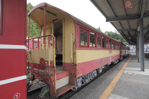 2020年、筆者(吉永陽一:写真作家)はこの珍編成を目撃し、増結の短編成側に赤とクリーム色を纏う見慣れぬデッキ付き客車、スハフ4の存在を確認しました。この客車の型式名はスハフ1形。1953(昭和28)年に帝国車輌工業社製という、井川線最古参の客車です。製造時はまだ中部電力専用鉄道の時代であり、作業員輸送に使用された後、路線が井川線へとなってから旅客列車で活躍してきました。いわば井川線の生き字引の存在に、「まだ走っていたのか」と感嘆の声を上げてしまったほどです。