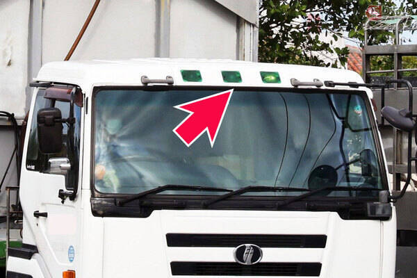 大型トラックは、暗い中でもその大きな車体の存在を周囲に知らせるために、側面にいくつかのマーカーランプを備えていますが、かつては車両のおでこ、キャビン(運転席)の上部にも、3つ並んで緑色に光るランプが見られました。