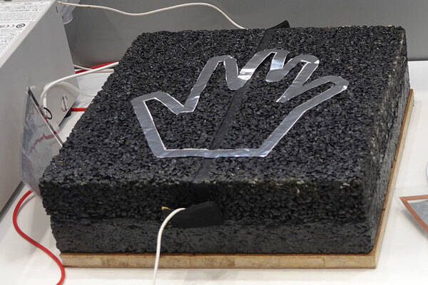 展示されていた舗装サンプル。手を置くと確かに発熱していた(乗りものニュース編集部撮影)。