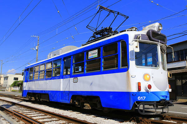 走ること30分。伊野方向から雑踏のなか現れたのは、まさに新幹線ラッピングのとさでん600形617号車です。かつては1974年に廃止された専用軌道「安芸線」への乗り入れも2両連結で行っていた車で、その名残りに密着型連結器とジャンパ線、エアホースが装備されています(現在は緊急時用のために装備)。