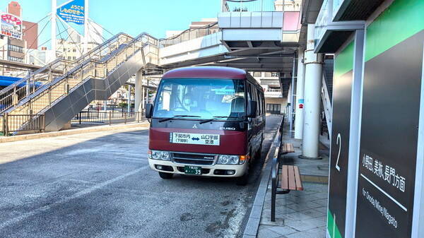 下関駅のバスロータリーに到着した空港シャトルバス。マイクロバスが使用される(水野二千翔撮影)