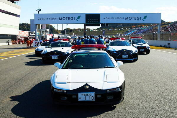 2022年のSUPER GTで、モビリティリゾートもてぎのサーキットに並んだ栃木県警のパトカーたち。先頭はホンダ「NSX」(画像:HRC)。