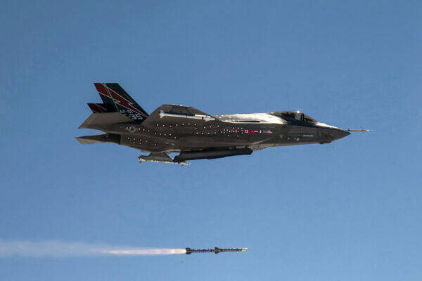 AIM-120「AMRAAM(アムラーム)」の発射実験を行う試作機時代のF-35(画像:RTX)。